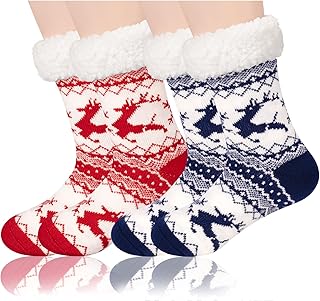Boao 2 Pairs Women's Warm Slipper Socks Christmas Fuzzy Socks Fleece-lined Non Slip Slipper Socks